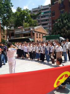 随后,抵达第二站中共三大旧址。参观前,苗兴成老师为同学们讲述了中共三大的时代背景意义,并向同学们提出殷切的期望。随即,大家在旧址前庄严地重温入团宣言,不忘初心,牢记使命,展望未来!虽然此时的广州骄阳似火,同学们身虽汗流浃背,心却静如止水。